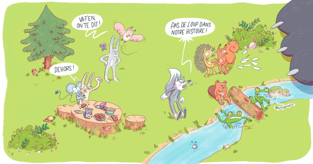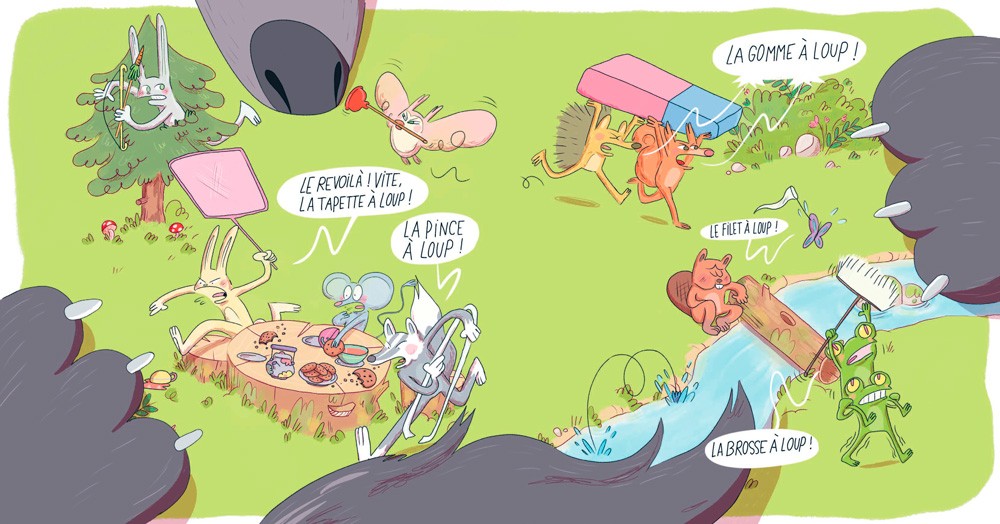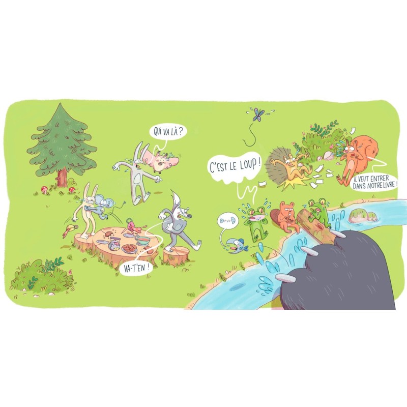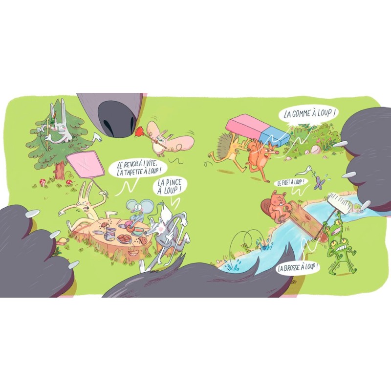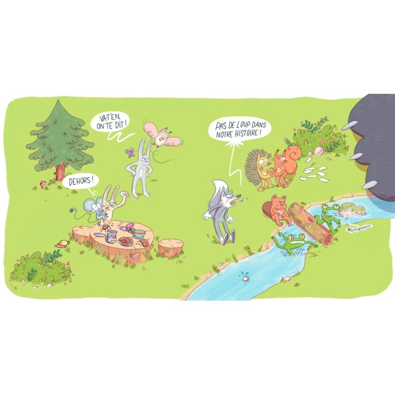 Des animaux mignons sont en train de pique niquer. On les observe dans une succession de double pages où on peut observer leurs actions et réactions alors qu’un loup tente de rentrer dans le livre par le côtés, par un trou dans le sol…