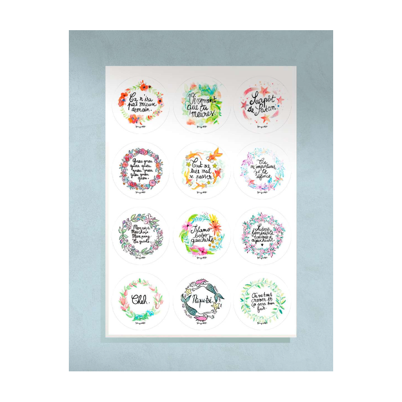Autrice : Garage Deloffre Visuels tirés des : Cartes de désavoeux Produit : Planche A4 avec 12 stickers Diamètre individuel de chaque sticker : 6.5 cm