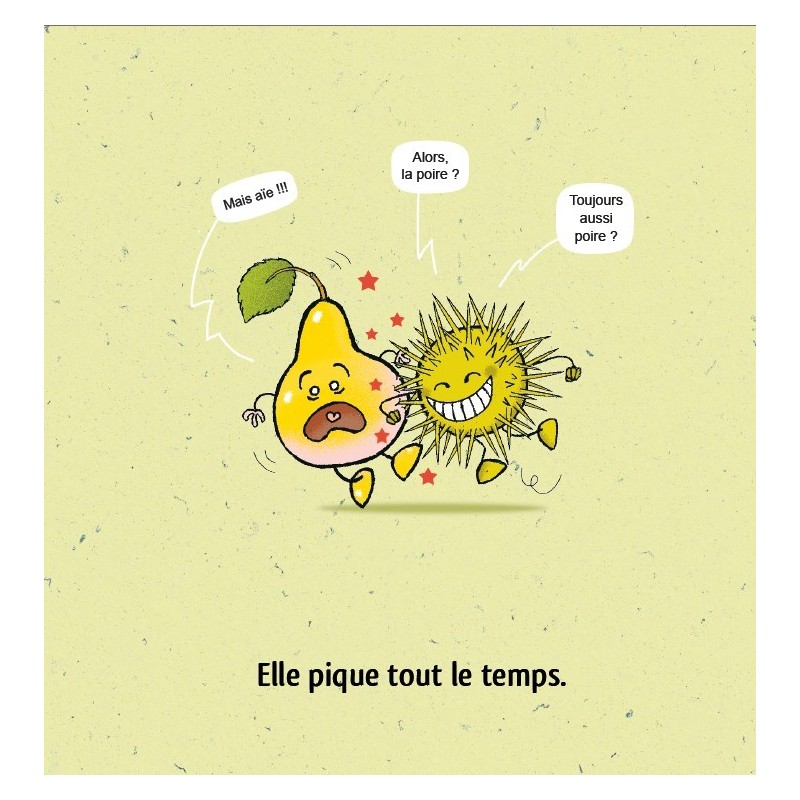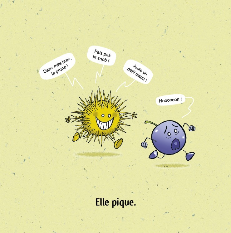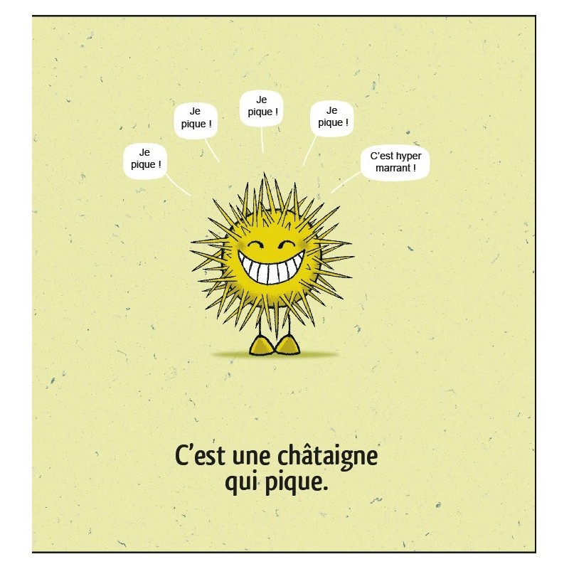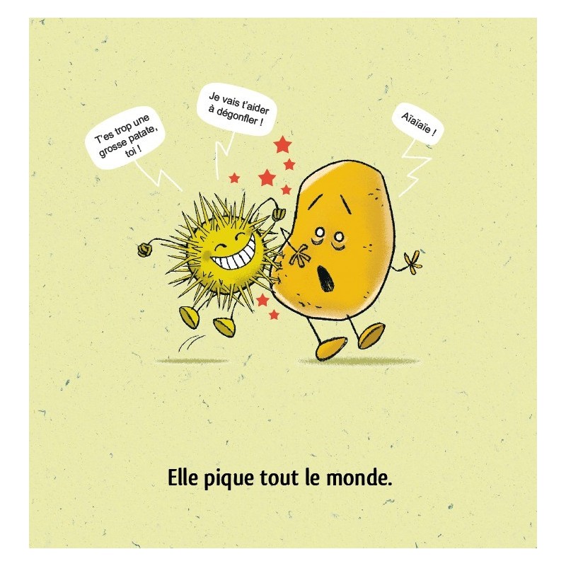 Châtaigne pique tout le monde pour rigoler. Ben oui ! C’est super marrant, puisque elle, ça la fait rire ! Mais il y en a plein qui n’ont pas d’humour. Ils disent que ça leur fait mal, ils protestent, et ils rouspètent. C’est n’importe quoi !… Mais Châtaigne a l’impression qu’on l’évite de plus en plus, et qu’on ne veut plus jouer avec elle… Mais enfin, pourquoi ? Puisque chez elle, on s’amuse comme ça ! Châtaigne ne comprend pas, mais elle commence à se poser des questions… Et peut-être à écouter vraiment ce qu’on lui dit.