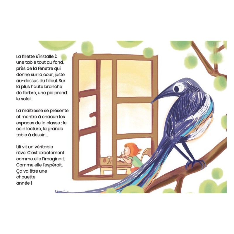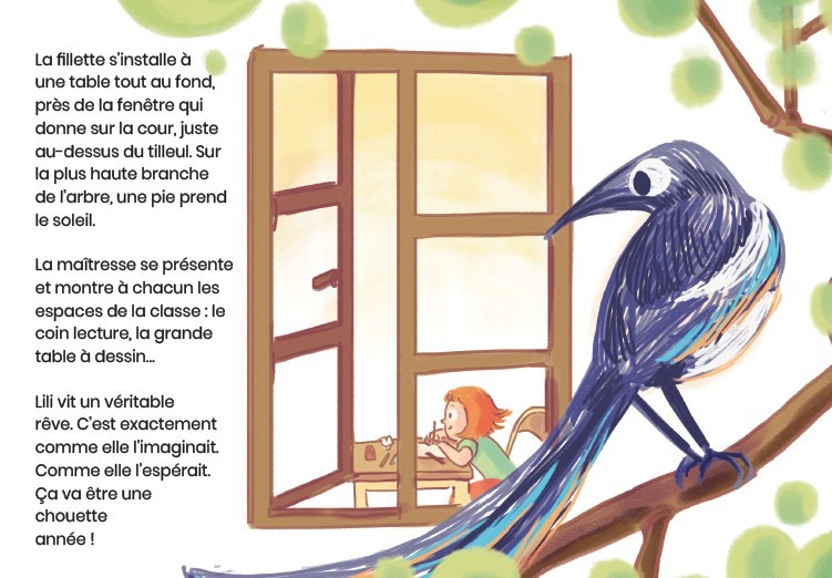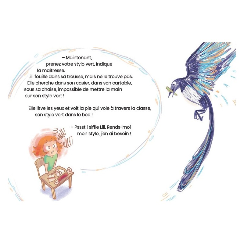 Lili entre au CP. Elle découvre avec bonheur sa nouvelle classe de grands. Elle a envie de montrer qu’elle sait plein de choses. Mais très vite, l’oiseau - celui qu’elle connait depuis la maternelle - passe dans le ciel, et il descend. Lili parle avec lui. Mais elle ne lui dit pas : « Sauve-moi, Joue avec moi, Oiseau », comme dans le poème de Prévert. Elle lui demande de la laisser écouter, de ne pas toucher à ses affaires. Mais peine perdue, la maîtresse s’interrompt et lui fait une première remarque. Cette pie de malheur va suivre Lili tout au long de sa journée, métaphore des troubles de l’attention qui empoisonnent la scolarité de la petite fille. Mais la maîtresse a appris à voir la pie...