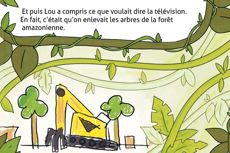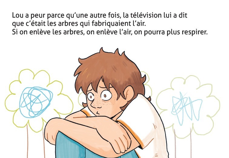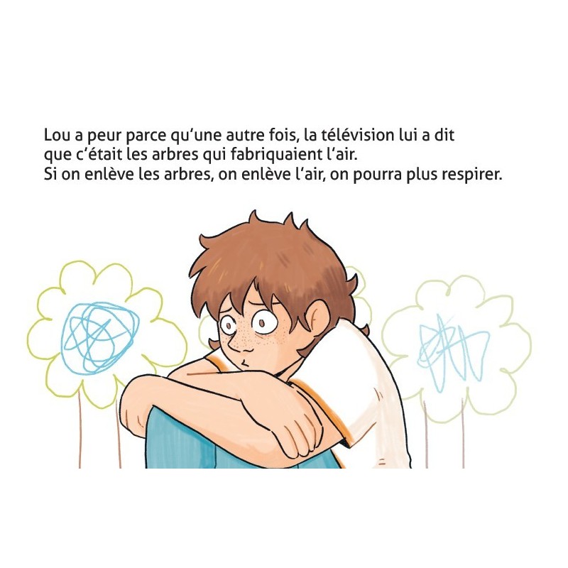 Lou a peur. Des informations à la télé lui font comprendre que l’air va manquer. Alors son sommeil devient agité. Pourra-t-on toujours respirer ? Comment sauver la planète ? Lou trouve du réconfort dans l’action. Il faut faire des réserves d’air. Dans des ballons, des récipients. Mais est-ce que ce sera suffisant ? Les réponses de Lou sont naïves et poétiques. Son apaisement surgit de son imaginaire.