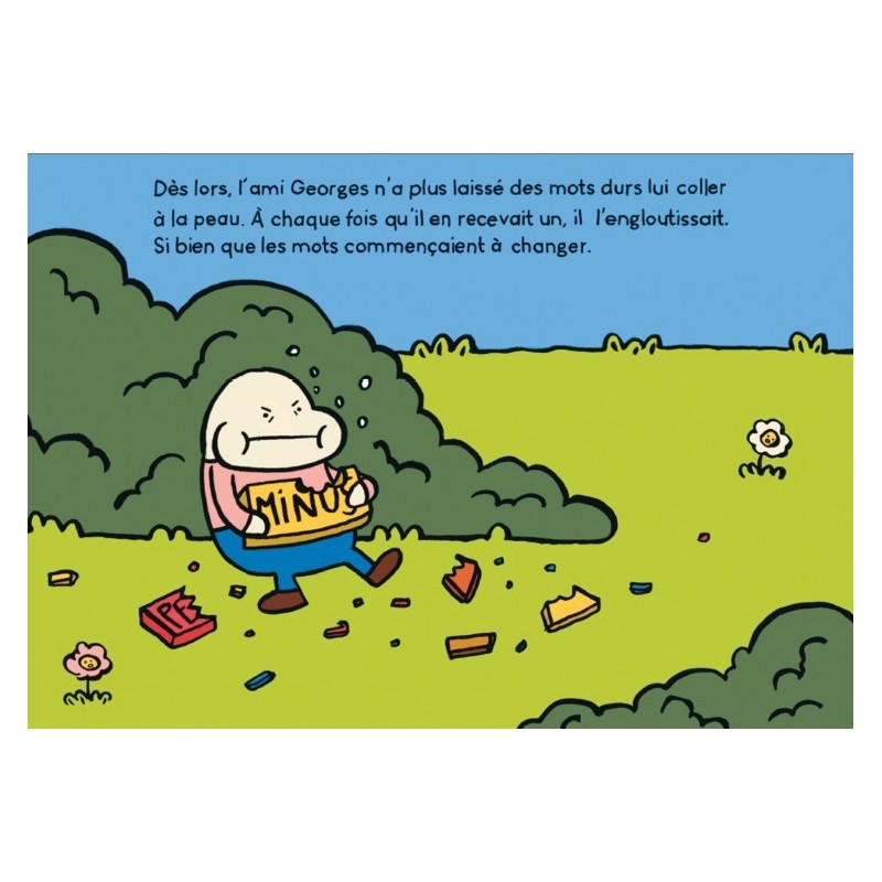 Les mots durs, ce sont des moqueries et des insultes, des mots qui font que quelqu’un se sent seul et triste. Quand il était enfant, Monsieur George a été blessé par des mots durs. Il est devenu obèse, un peu à cause d’eux. Son corps et sa tête ont réagi comme ça. Sa vie n’est pas facile. Quand Monsieur George rencontre Mademoiselle Prune, il tombe amoureux. Mais il apprend aussi à s’aimer. Il devient un monsieur qui va bien, dans sa tête et dans son corps.