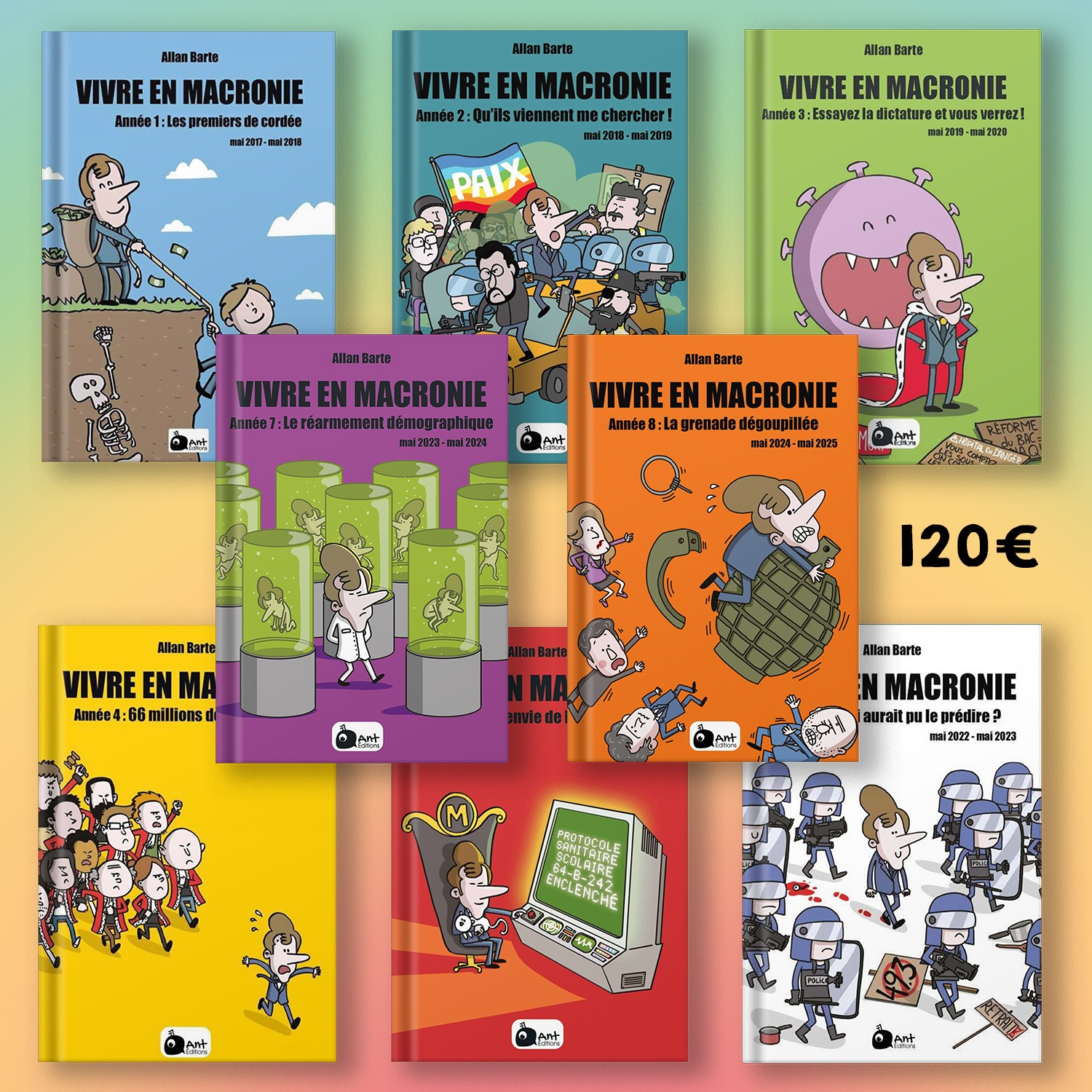 Auteur : Allan Barte Éditeur : Ant éditions Prix TTC : 120 euros Contenu du pack : Les huit tomes de Vivre en Macronie Format : 155 mm x 210 mm Couvertures : cartonnées