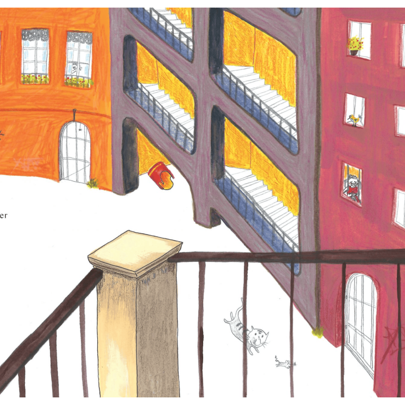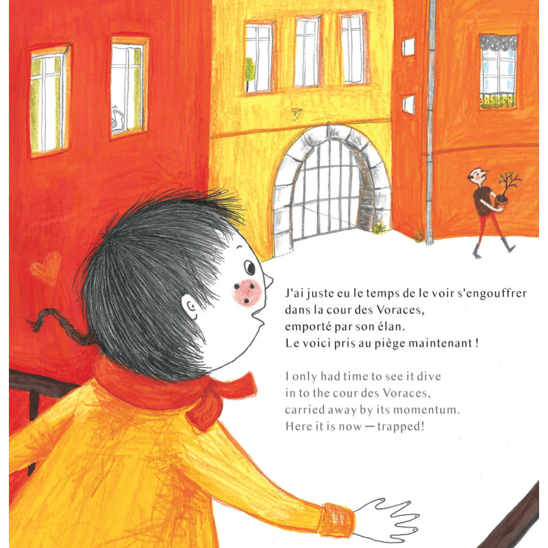 Ce coquin s’échappe et roule toujours plus loin. Avec cette course-poursuite, il promène son propriétaire de surprise en surprise sur les pentes de la vieille ville … toujours plus haut jusqu’au plateau. Cette histoire est une magnifique occasion de parler du patrimoine des vieilles villes. La ville de Lyon en est le décor, plus particulièrement le quartier des pentes et du plateau de la Croix-Rousse. Ainsi l’illustratrice Laureline Masson a choisi comme personnage principal un petit canut (les canuts étaient les ouvriers qui tissaient la soie dans ce même quartier au 19ème siècle). Il est reconnaissable grâce à ses habits et son chapeau, tout comme le célèbre Guignol lyonnais. Un petit lexique du parler lyonnais accompagne l'histoire.