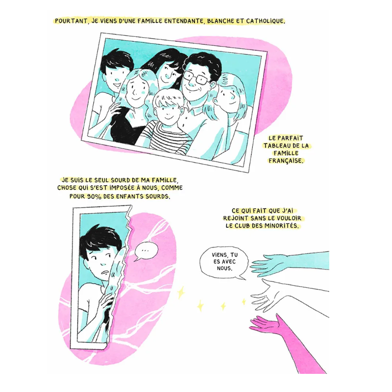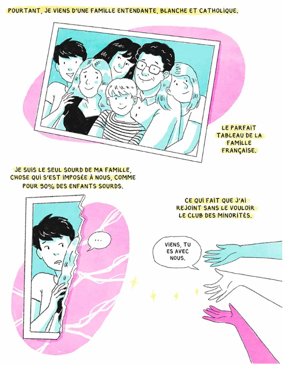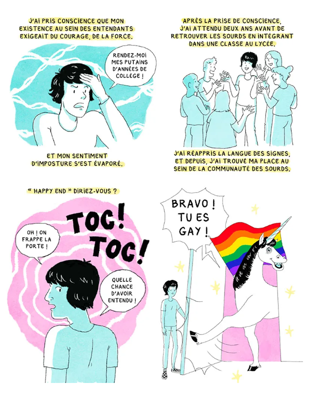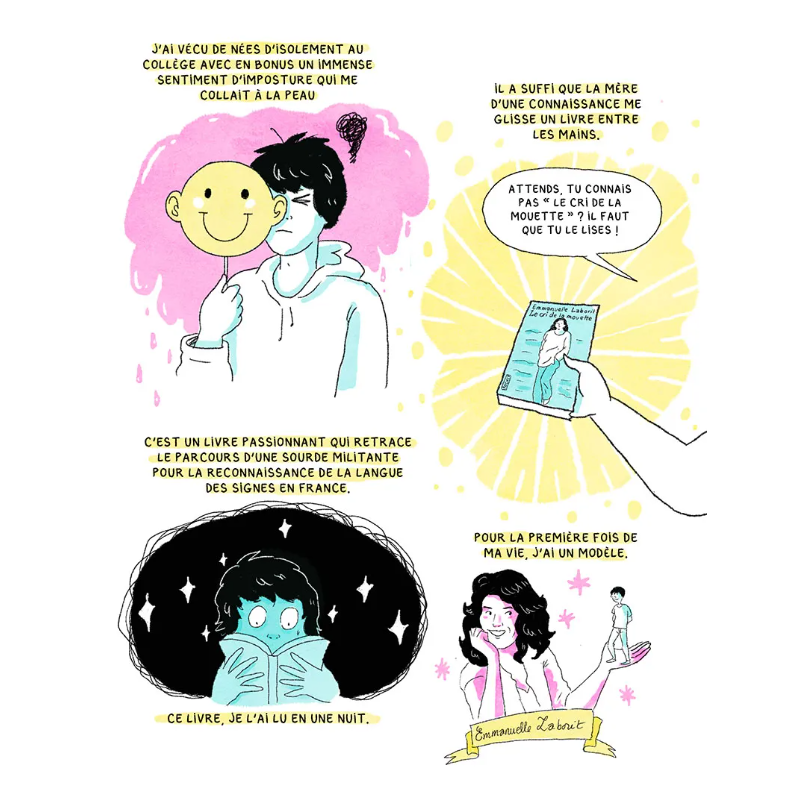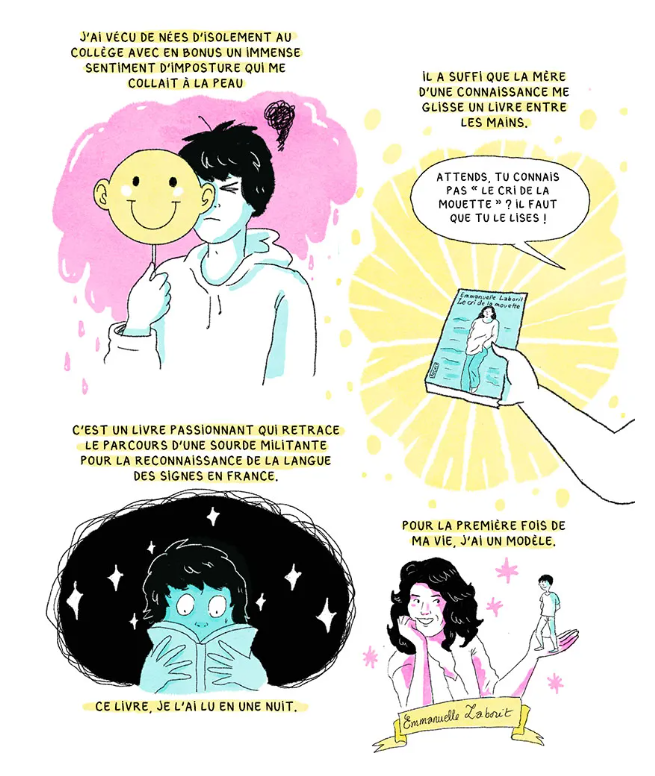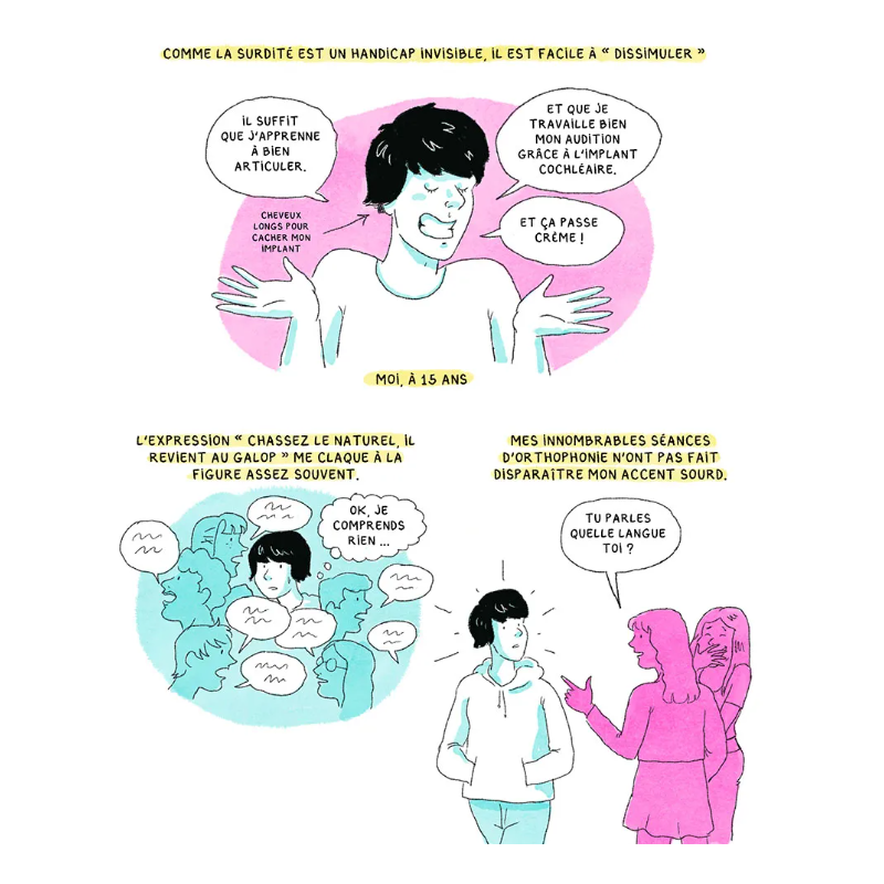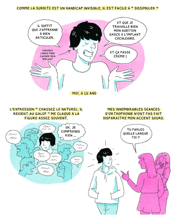 Coco Chanel a refusé d'écrire son autobiographie, affirmant qu'elle n'avait pas de mémoire et que « Si tout le monde sait tout de vous, vous devenez comme tout le monde ». Contrairement à elle, je ne suis pas encore une icône de la mode, mais je raconte ma vie avec style ! Ma BD s'inspire de ma vie quotidienne, je raconte avec humour des anecdotes liées à la surdité. Dialogues de sourd, c’est une mise en abyme de la complexité relationnelle entre deux mondes différents qui ne savent pas comment communiquer.