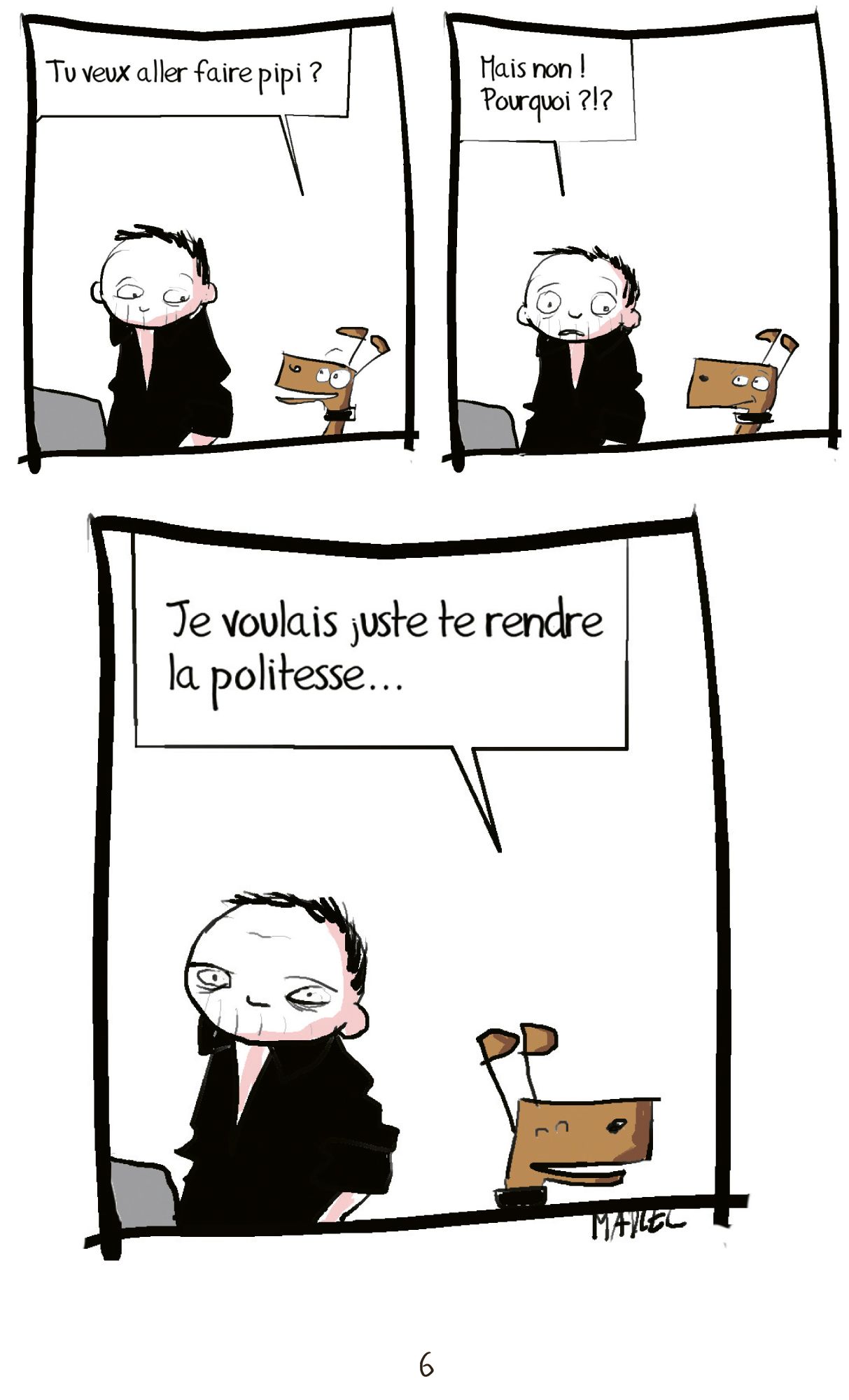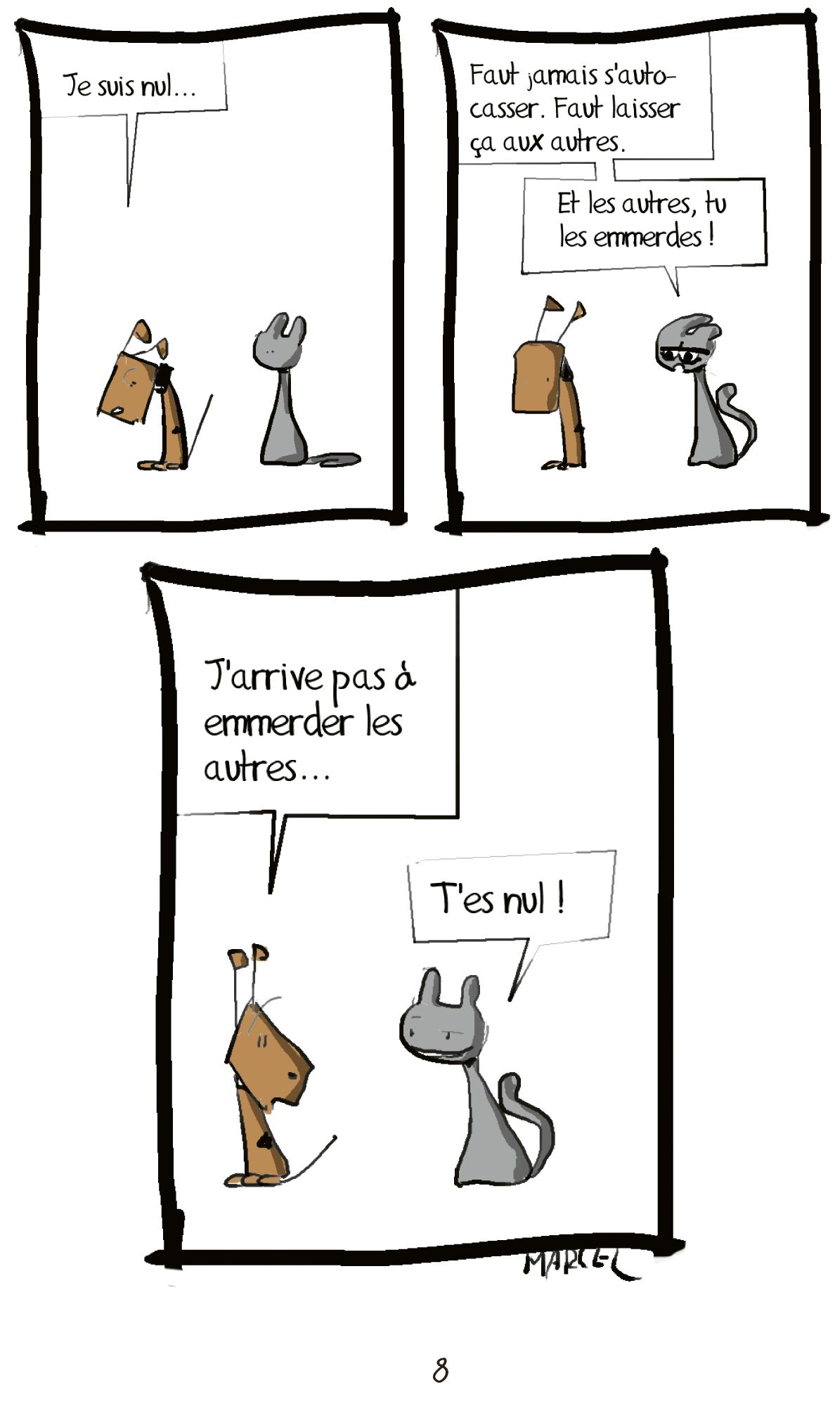 Les aventures de Fifike, chien flamand philosophe un peu trash et de son maître Marcel, musicien un peu dépressif. Avec aussi un chat.
