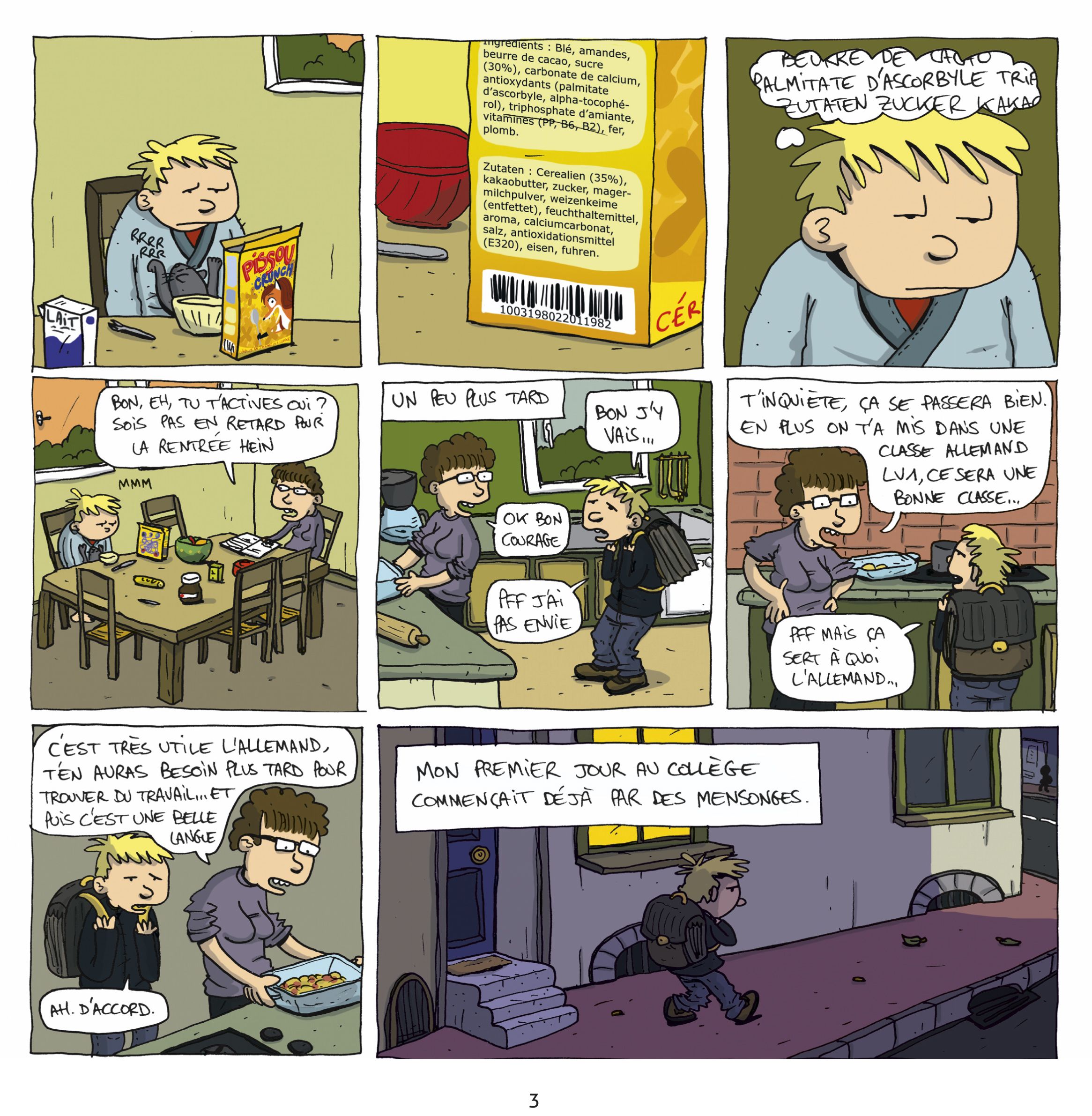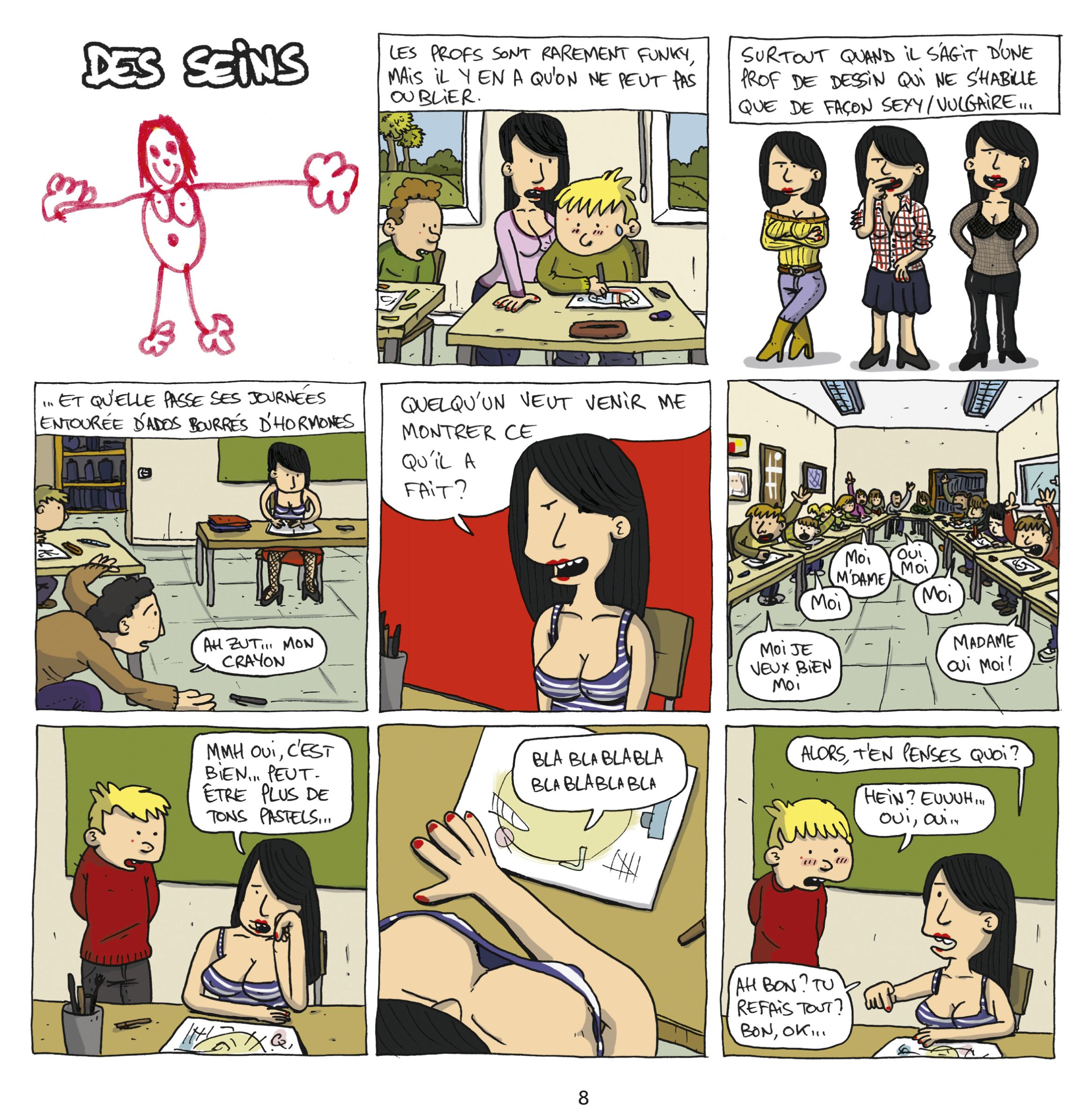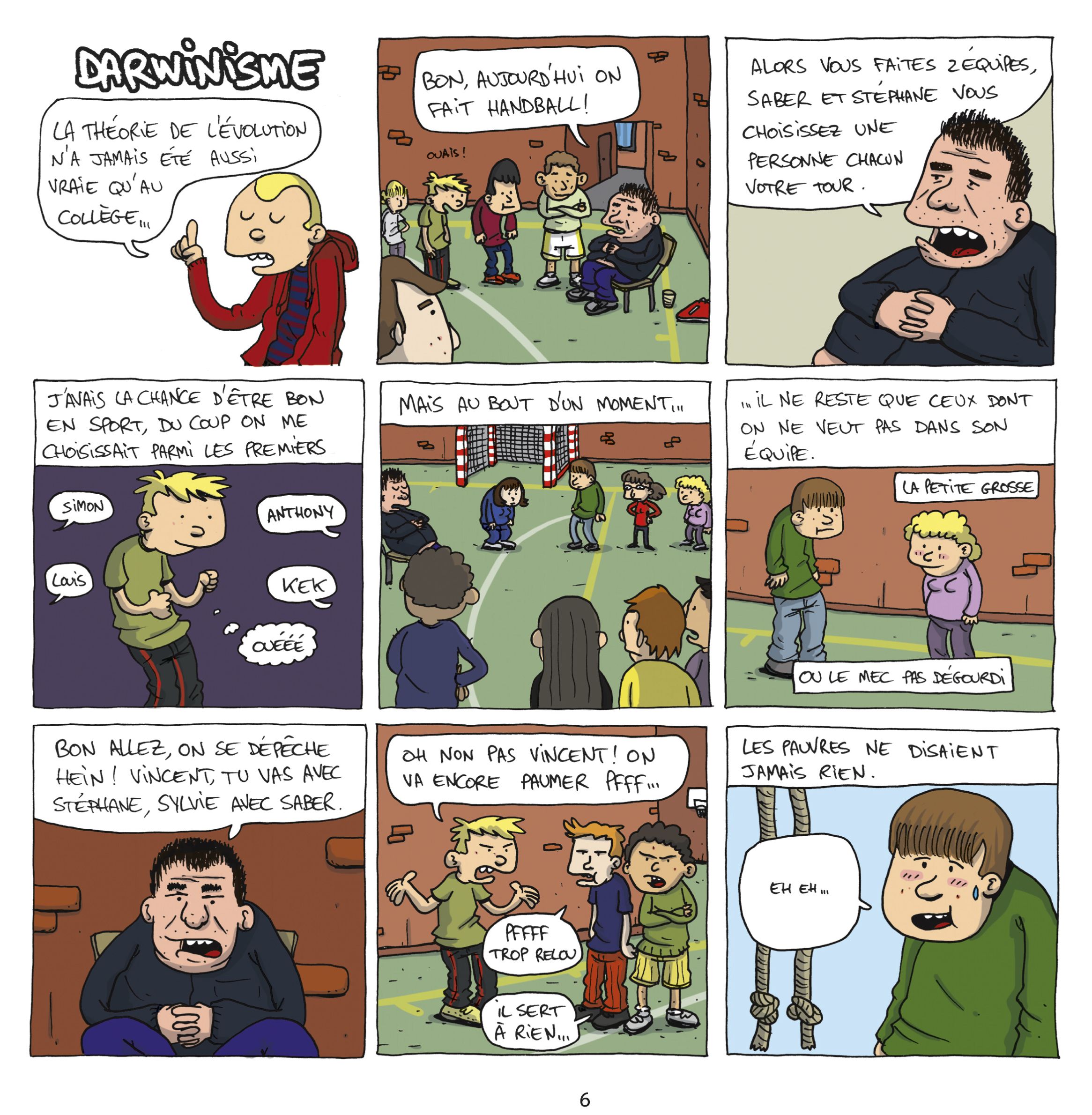 Derrière l’ironie enfantine mordante, et entre quelques clins d’œil glissés à d’autres auteurs comme Pénélope Bagieu ou Lolita Séchan, Kek décline une vision panoramique de ses jeunes années scolaires, passant des cas sociaux trop oubliés sur les bancs de son établissement aux premiers de la classe forcément têtes à claques.