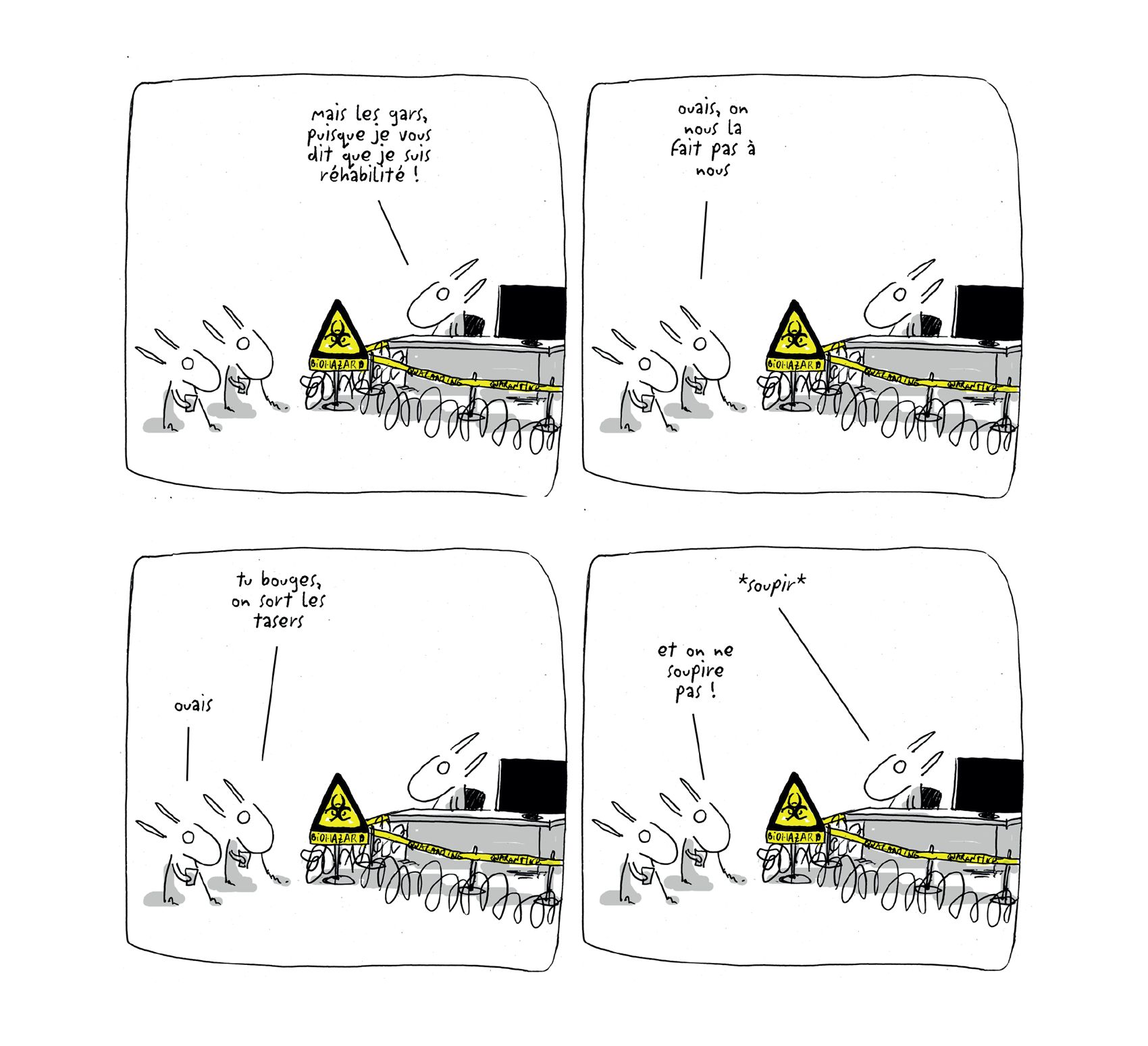 Il va découvrir que le « chef » dans « chef de projet » est plus proche de l’ironie que de la description objective... « De l’absurde de haut niveau, du gag saignant, des lapins en grande forme. » - un voisin