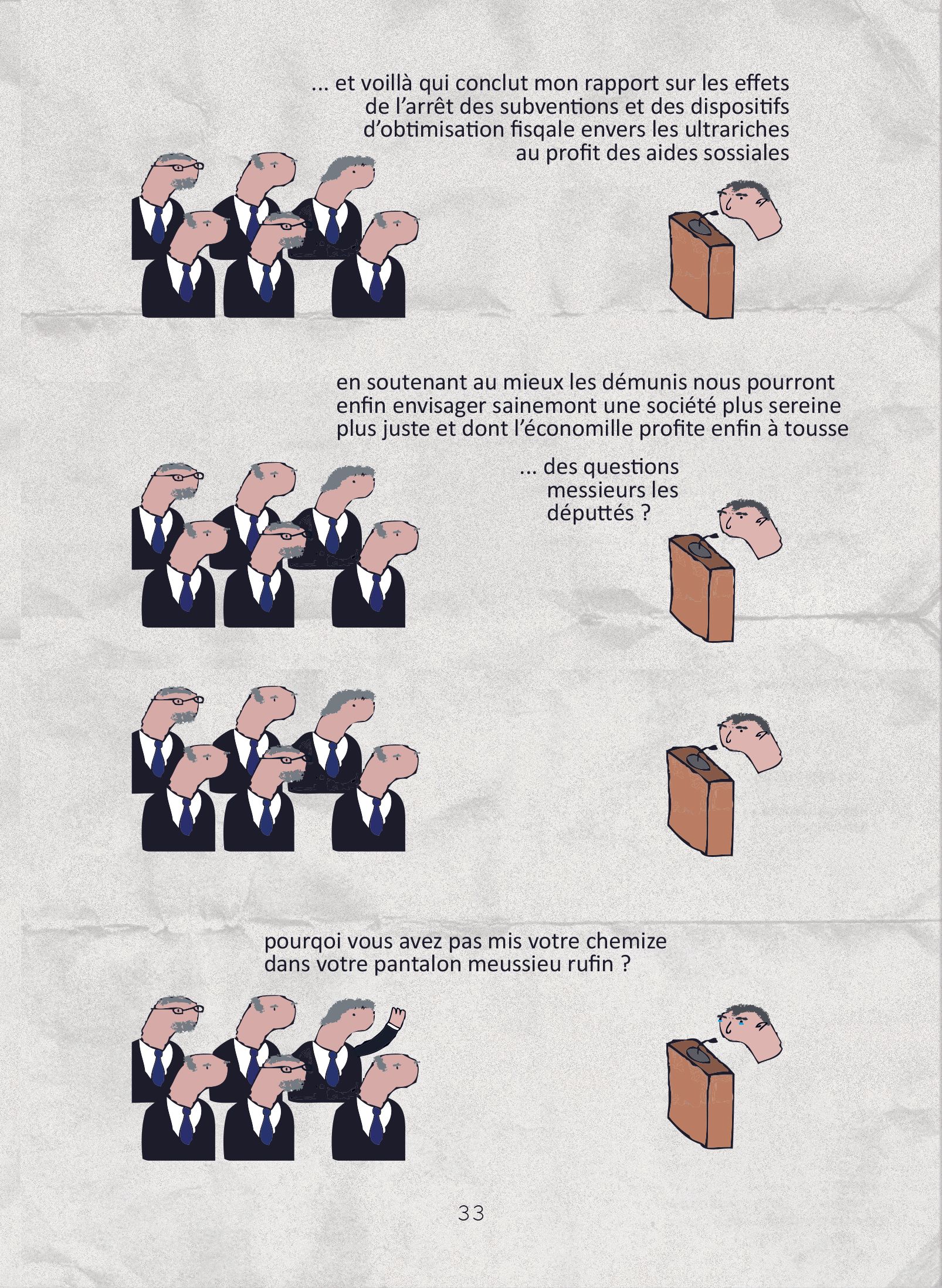 Bill Vezay, aka Tarsi, est un auteur et créateur web multifonction de 1m75 sur 50cm, passionné par la fiction sous toutes ses formes : séries, bandes dessinées, sites web interactifs, jeux vidéo... À l’heure actuelle il continue d’explorer de nouveaux horizons sur son site ouaibe tarsi.fr, et ce en toute impunité. 2014 : le larron susmentionné lance Much Politik, journal indépondant et san concecion. Auprès d’un peuple lassé de la complaisance des média traditionnels, le succès du magazine est fulgurant. Suivent bientôt deux albums papier pas piqués des ânes-thons — ainsi qu’un troisième, que tu tiens en ce moment même entre tes petits doigts graciles et boudinés.