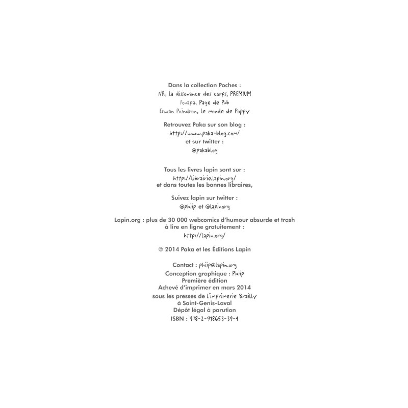 Dans l'optique de poursuivre une démarche écologique, lapin a décidé de ne pas détruire les retours libraires. Ce sont des livres considérés comme d'occasion et qui présentent des défauts : petites tâches, coins cornés, rayures sur la couverture... mais sont toujours tout à fait lisibles. Ne pouvant pas les remettre dans le circuit au milieu des livres neufs, nous préférons leur donner une seconde vie en vous les proposant à tout petit prix.
