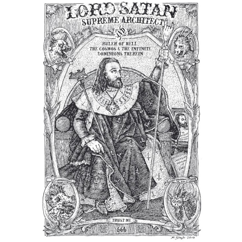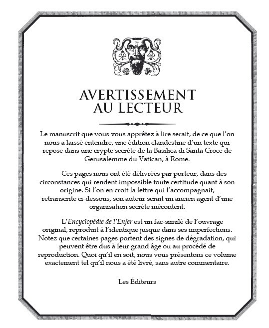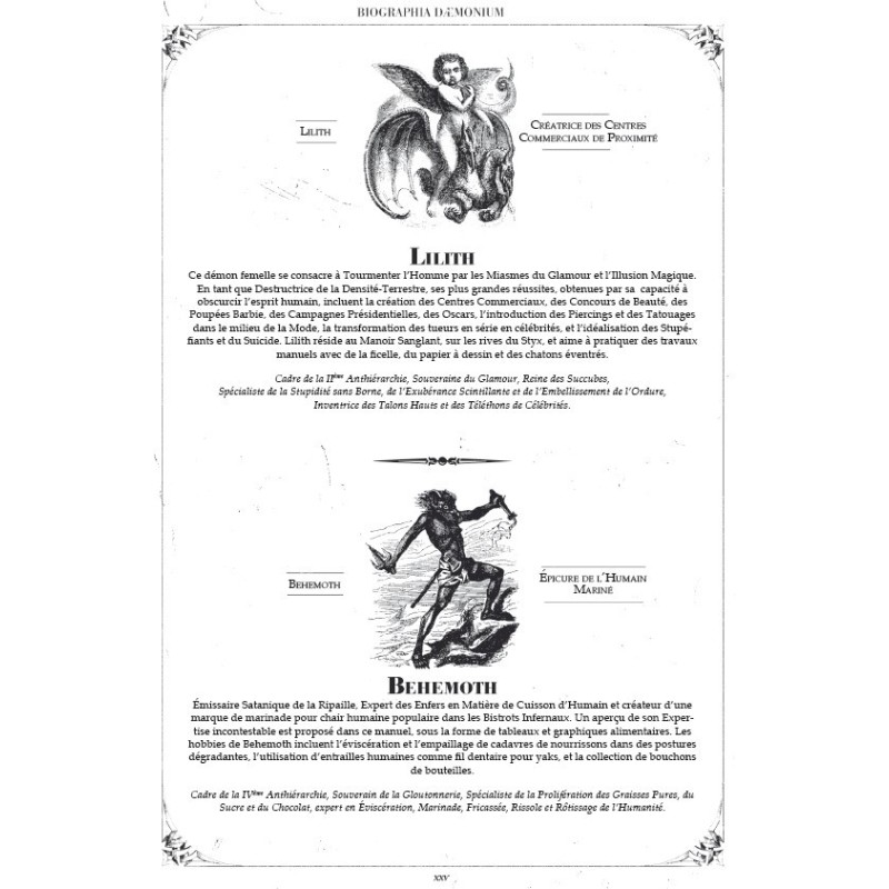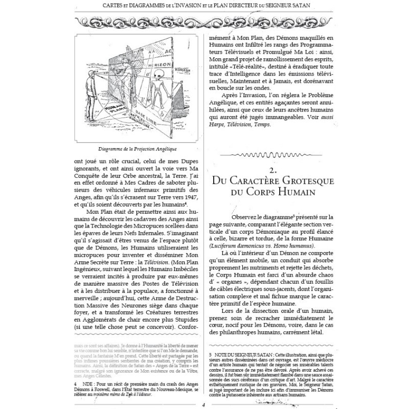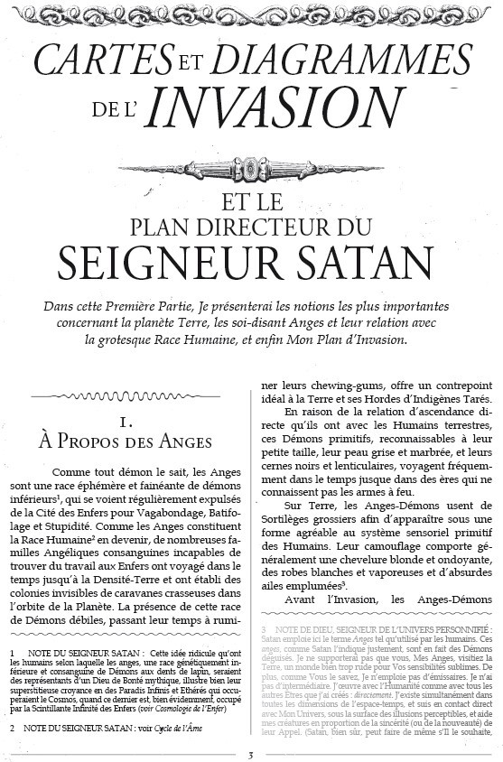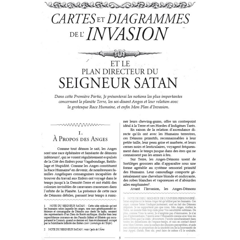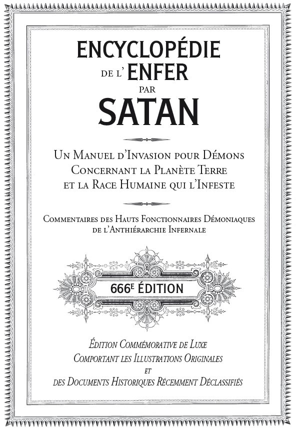 L’Enfer devenant gravement surpeuplé, le Seigneur Satan a besoin de plus de territoire pour ses Damnés. Heureusement la chair humaine est excellente pour la digestion démonique si elle est correctement sautée. Étant donné que les us et coutumes des humains sont totalement inconcevables pour les démons, Satan a écrit cet étrange manuel poétique et militaire pour l’édification de Ses démons envahisseurs afin de faciliter Son invasion de la Terre.