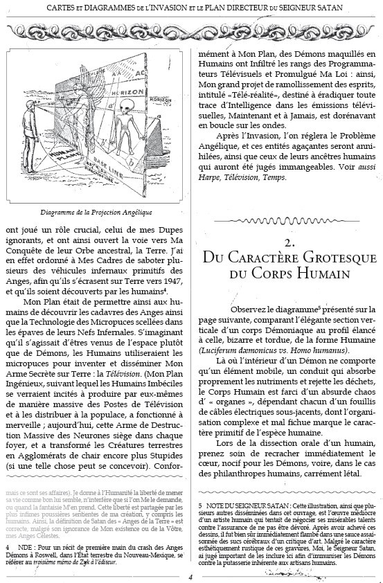 Ce livre inclut de nombreuses illustrations dérangeantes, des diagrammes, des recettes, et un dictionnaire des termes terriens complet quoique tout à fait répugnant. Ce chef d’oeuvre exprime toute la haine de Satan pour l’humanité et pour lui-même et il inclut dans sa partie encyclopédique "les techniques pour traquer et manger les humains", "les différentes méthodes pour faire des conserves de pus humain" et "comment découper en tranches ou en dés les orphelins humains".
