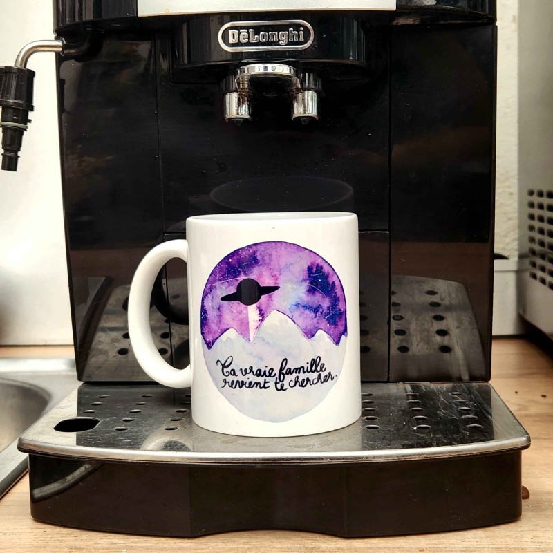 Mug en céramique blanc. Impression du visuel d'un côté, logo de Garage Deloffre, en noir et blanc, de l'autre. La taille du logo peut varier.