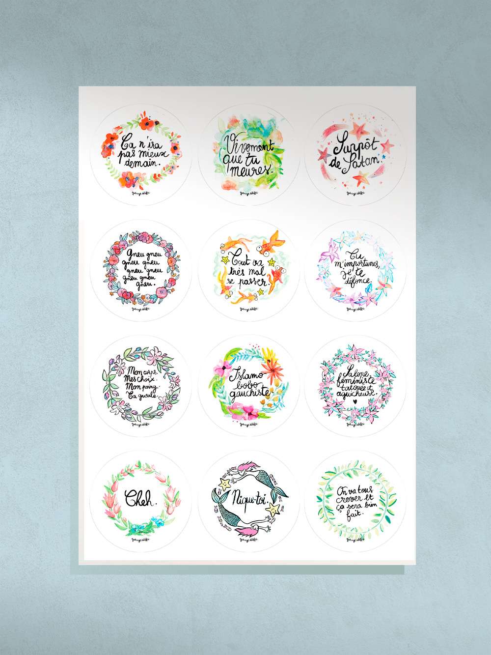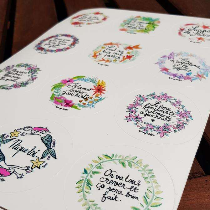 Autrice : Garage Deloffre Visuels tirés des : Cartes de désavoeux Produit : Planche A4 avec 12 stickers Diamètre individuel de chaque sticker : 6.5 cm