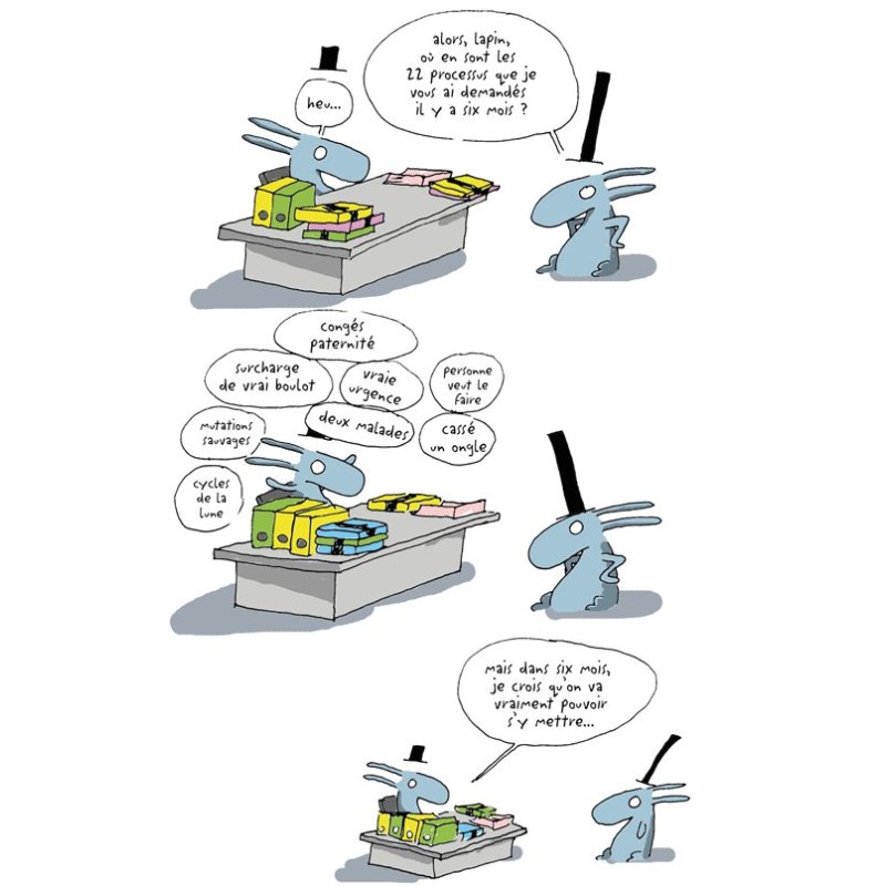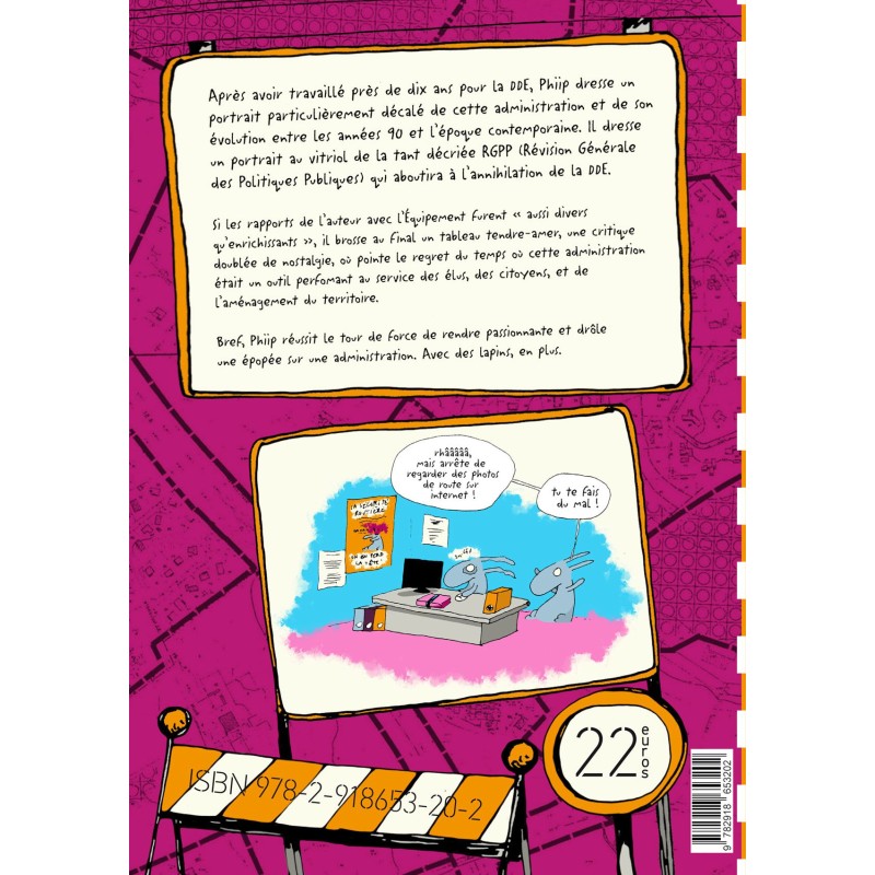 L’auteur et fonctionnaire Phiip, qui se plait à dessiner des lapins dans toutes les situations de la vie quotidienne au bureau, revient en commettant un nouvel ouvrage à hurler de rire : Pas de RTT pour la DDE…avec des situations qui vous rappelleront surement des souvenirs et une vraie problématique en toile de fond, dixit l’auteur lui-même : « Lorsque, un peu par accident, je me suis à nouveau retrouvé à la DDE, j’ai été stupéfait de voir ce qu’il en restait : une administration de gens motivés et travailleurs (si si) avec une légère (hmm) tendance à la technocratie avait été dépiautée de tous les métiers qui en faisaient la richesse, en particulier ceux de la route et de l’urbanisme pour devenir un espèce de machin indéfini donneur de leçons, chipoteur et terrifié par les mairies et les élus. Ce qui m’aura le plus frappé, c’est les gens, abattus par la RGPP et empreints d’une telle nostalgie... »