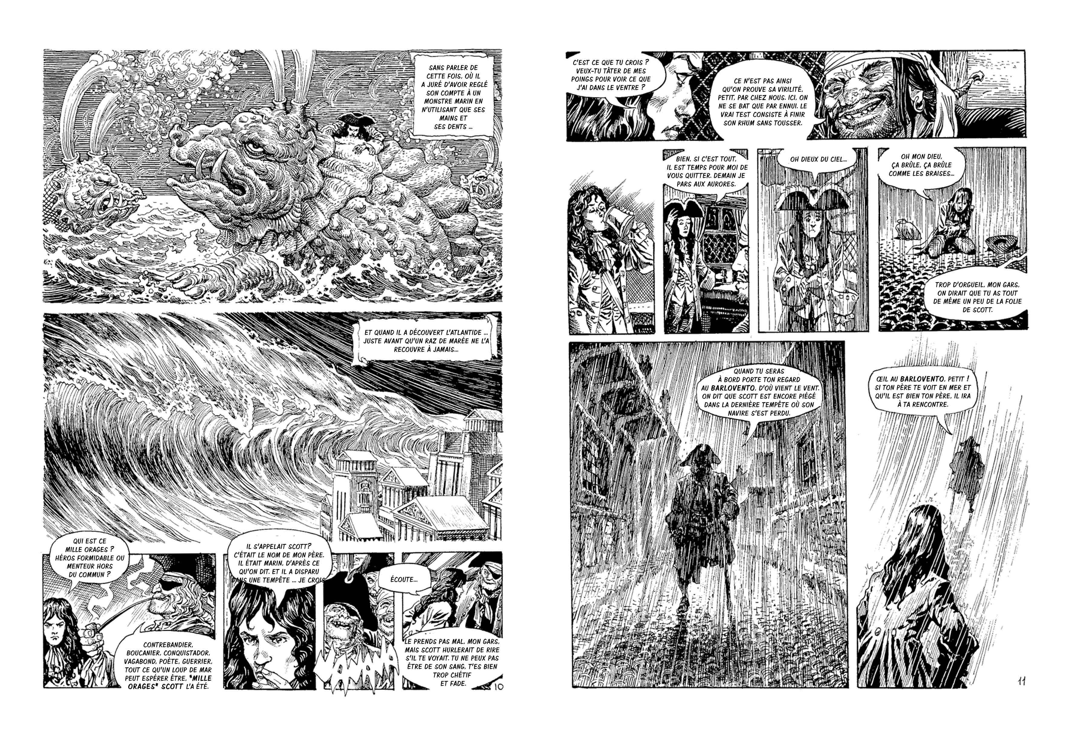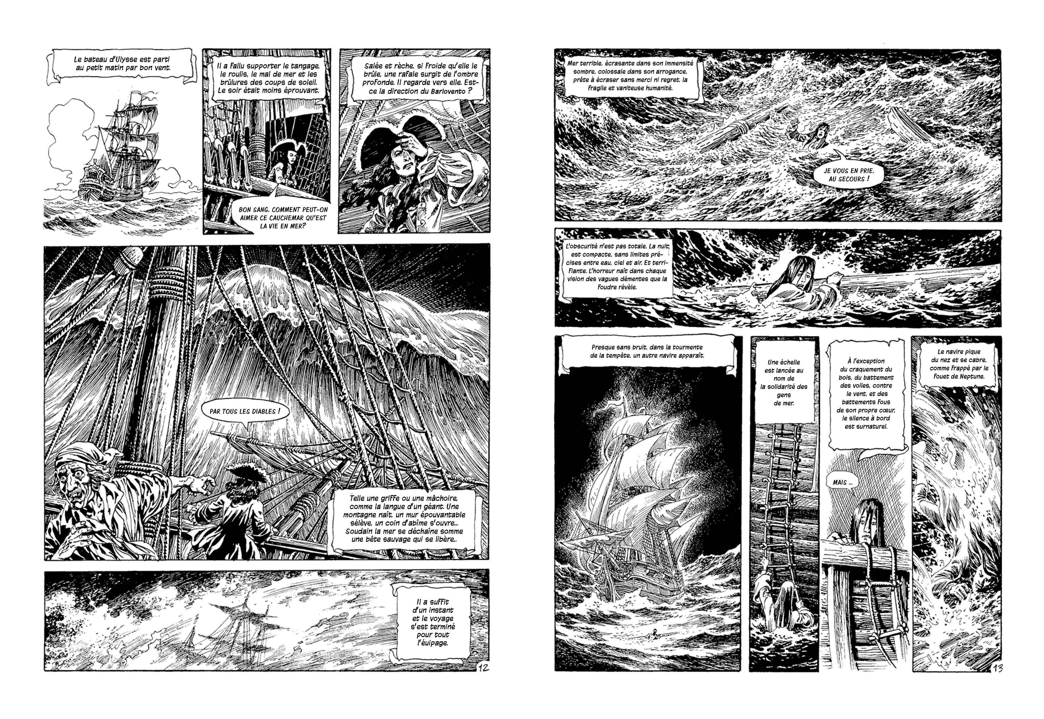 Le dessin d’Alcatena, à la plume, nerveux et fourmillant de détails réalise des prodiges techniques à tomber à la renverse, pour offrir au lecteur un univers foisonnant et inventif. Les textes de Mazziteli ont un force poétiques qui donne un souffle épique à cet étrange voyage à travers les mythes et les légendes maritimes.