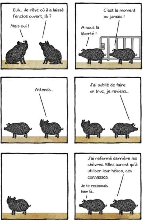 6 cases, 2 porcs, 112 pages... Une foule de possibilités ! Nena nous emmène dans le quotidien relationnel et intellectuel étonnamment raffiné de 2 porcs férus de bibliothèque, de Playstation et de philosophie. Avec l'abattoir pour seul horizon, ils se questionnent : qu'attendre de la vie quand on est voué à la rillette et que les chèvres, ces connasses, ne sont d'aucun soutien ? Une courte évasion leur fera découvrir la mode et le hamburger, avant que, résignés, ils ne se tournent vers la religion. De l'humour absurde façon cochon.