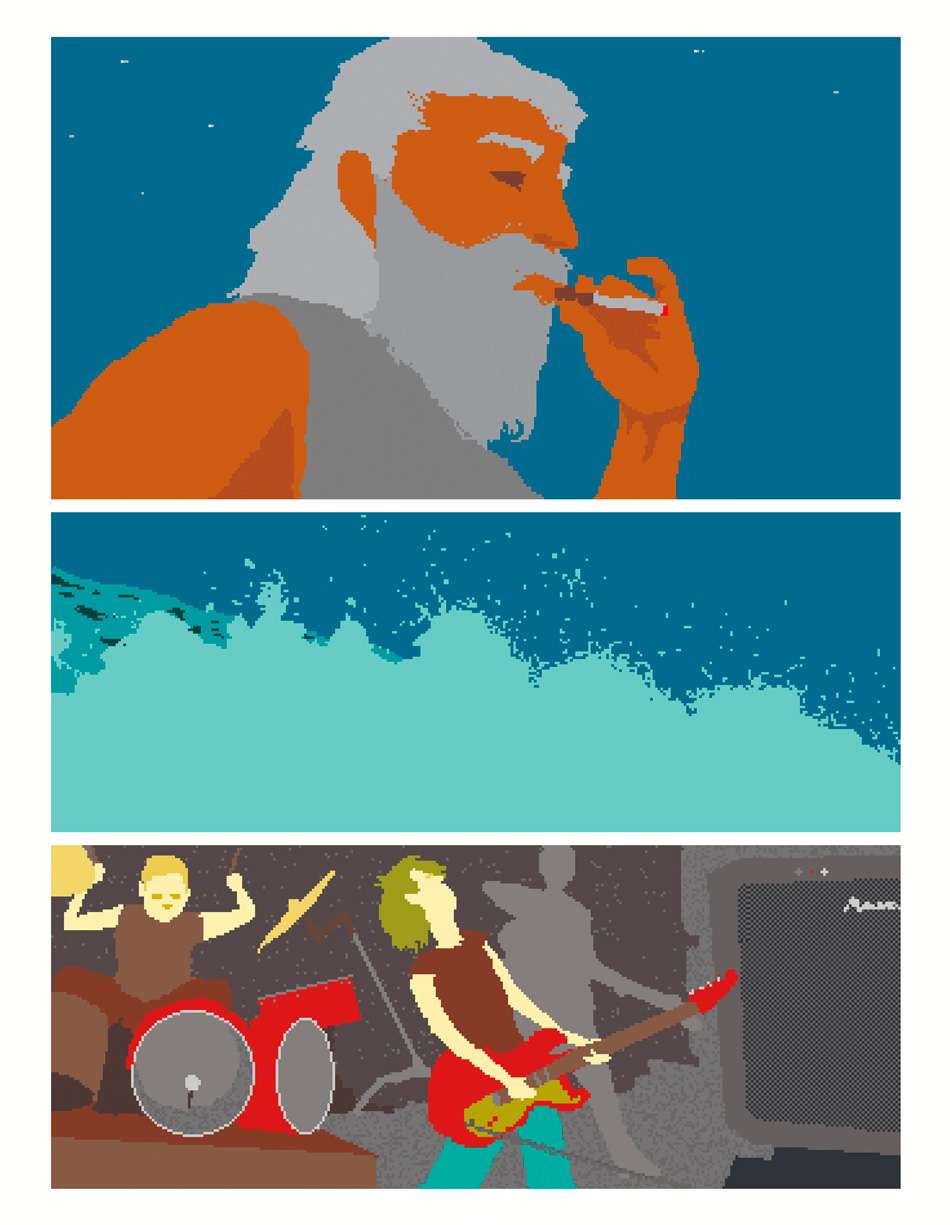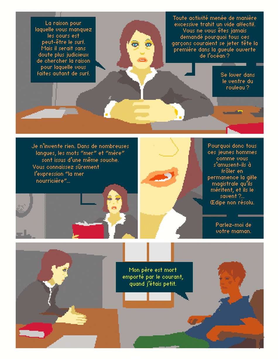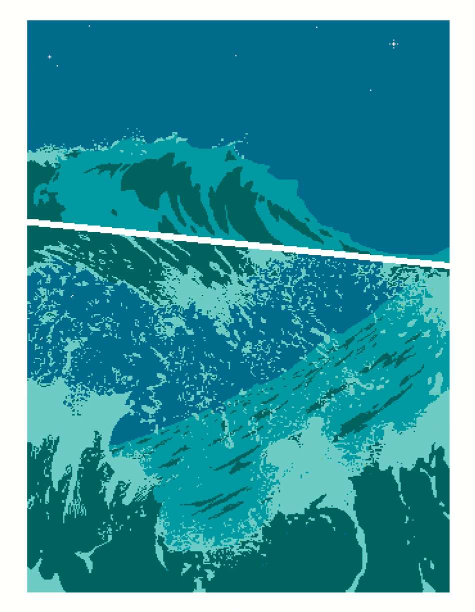 Jouant avec les codes du récit de surf et convoquant une esthétique rétro inspirée des jeux vidéos des années 1990, EMG réalise une œuvre surprenante, à la fois grave et légère, tenant autant du conte psychanalytique que de la série B.