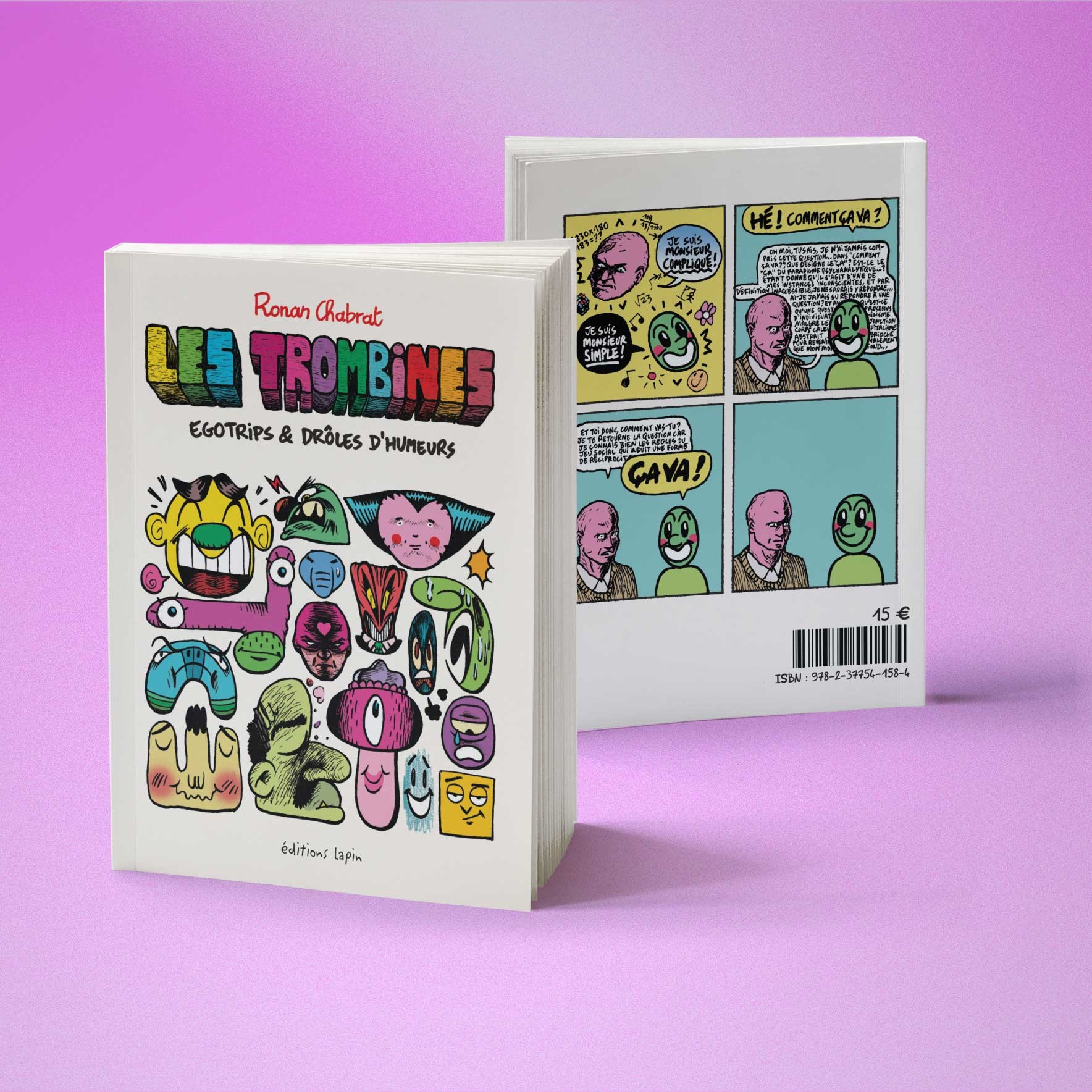 L’habit ne fait pas le moine, et c’est une chose que notre auteur a bien comprise. Dans ce recueil de strips, Ronan Chabrat joue avec les faciès et nous invite dans son joyeux bazar. Ici, que ce soit en solo, duo ou trio, chaque « trombine » révèle aux lecteur·ices sa poésie, ses sentiments, ses rires, ses maladresses, ses réflexions bizarres, ses névroses... Toujours décalés, les strips de Ronan ne peuvent laisser de marbre. Au mieux, ils feront rire aux éclats, au pire réfléchir au sens ou à l’absurde de la vie. Il faut donc voir ce livre à l’instar de la vie : bizarre, plurielle, mais gardant toujours son lot de surprises...
