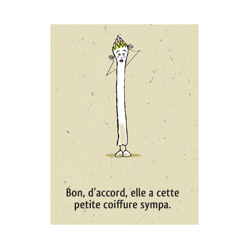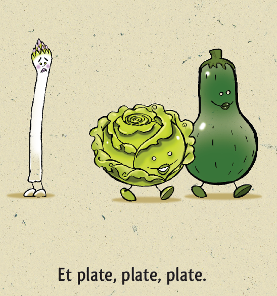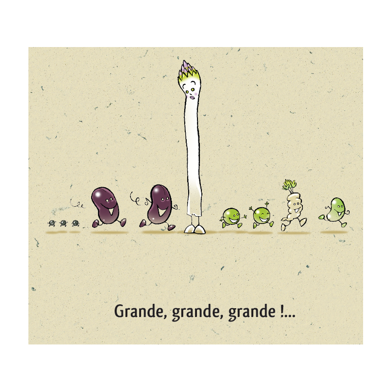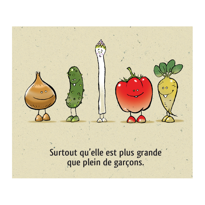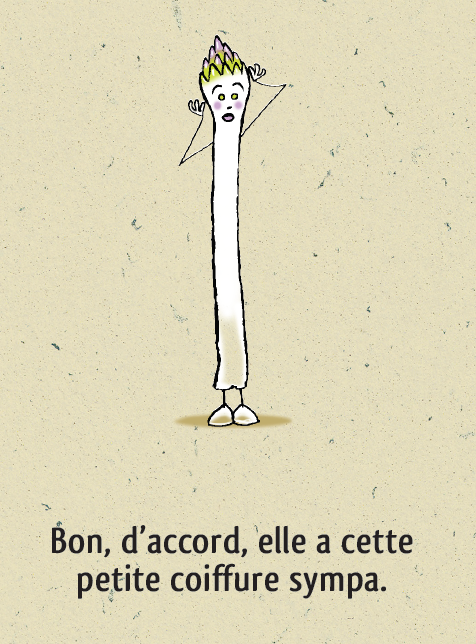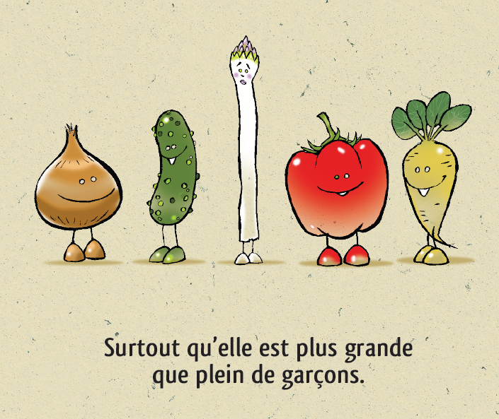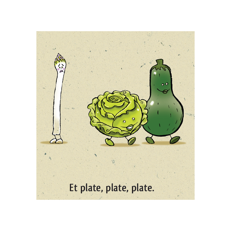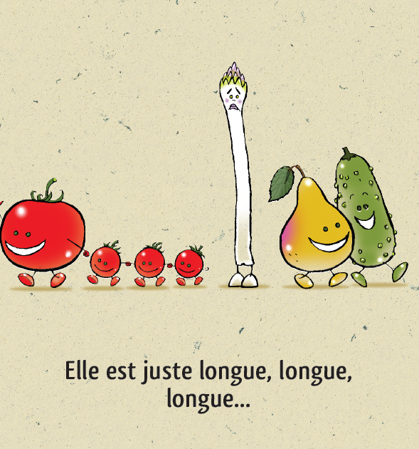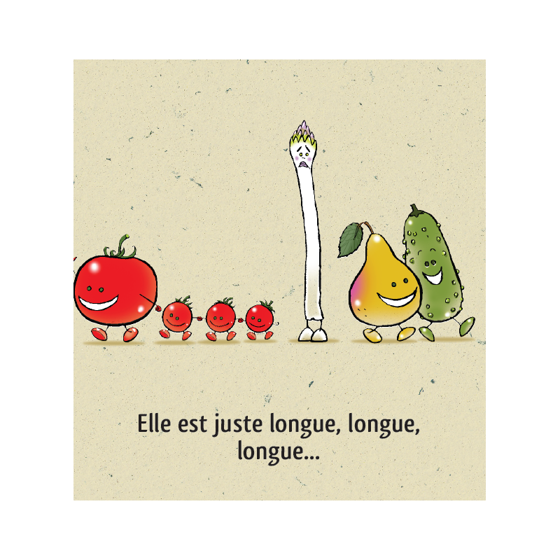 Asperge est complexée, très complexée par son corps. Trop grande, trop fine, trop petite, trop blanche… Elle se reproche tout et se compare beaucoup à tous ses camarades légumes du potager. Mais elle va découvrir que le piment si beau la trouve jolie, alors elle se dit que peut-être il a raison.